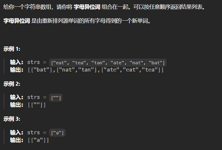 • 将每个字符串排序后作为key,原字符串存入value列表当中。最终只需要打印出每组value即可。